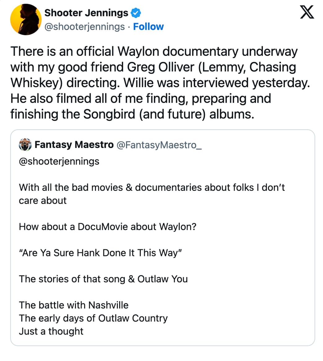 “There is an official Waylon documentary underway with my good friend Greg Olliver directing,” Shooter shared. “Willie was interviewed yesterday. He also filmed all of me finding, preparing and finishing the ‘Songbird’ and future albums.”